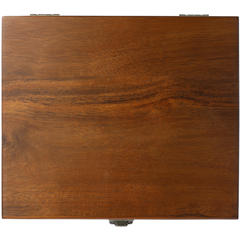 The Graze Wood and Metal Wine Set has a polished acacia wood box with metal embellishments for efficient storage. The set comes with a bottle opener, a foil seal cutter, a drip ring, a thermometer, a pourer, two wine stoppers, and two replacement corkscrew components.